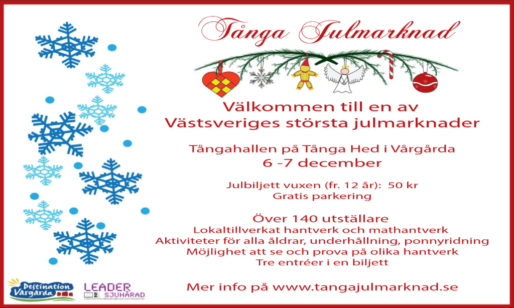 2013 fick jag i uppdrag av Destination Vårgårda att bygga upp en ny julmarknad för att sätta Vårgårda på kartan. Julmarknaden skulle anordnas året därpå i Tångahallen, en inomhusarena för sport, belägen på Tånga Hed, ett gammalt militärområde strax utanför Vårgårda. Projektgruppen bestod av olika intressenter från näringsliv, politiken, turismsamordnare och kommunen. Det initiala målet var att ha 30 utställare och omkring 1000 besökare. Efter min förstudie föreslog jag att man siktade på 50 utställare. Jag researchade andra julmarknader under hösten 2013 och pratade med hantverkare och konstnärer som var potentiella utställare, för att utröna vilka önskemål som fanns från deras håll. Jag bollade också en del nyskapande idéer som jag hade för att göra vår julmarknad mer speciell och intressant för både utställare och besökare. Bland annat anordnade vi workshops där besökare kunde se eller prova på olika typer av hantverk under julmarknaden. Vi erbjöd boende, måltider och en afterwork för utställarna, där de kunde utbyta erfarenheter och socialisera med varandra. I slutändan hade 154 hantverkare och mathantverkare anmält sig och Tånga Julmarknad kvalificerade sig därmed som Västsveriges och sedan även Sveriges största julmarknad inomhus, redan det första året.